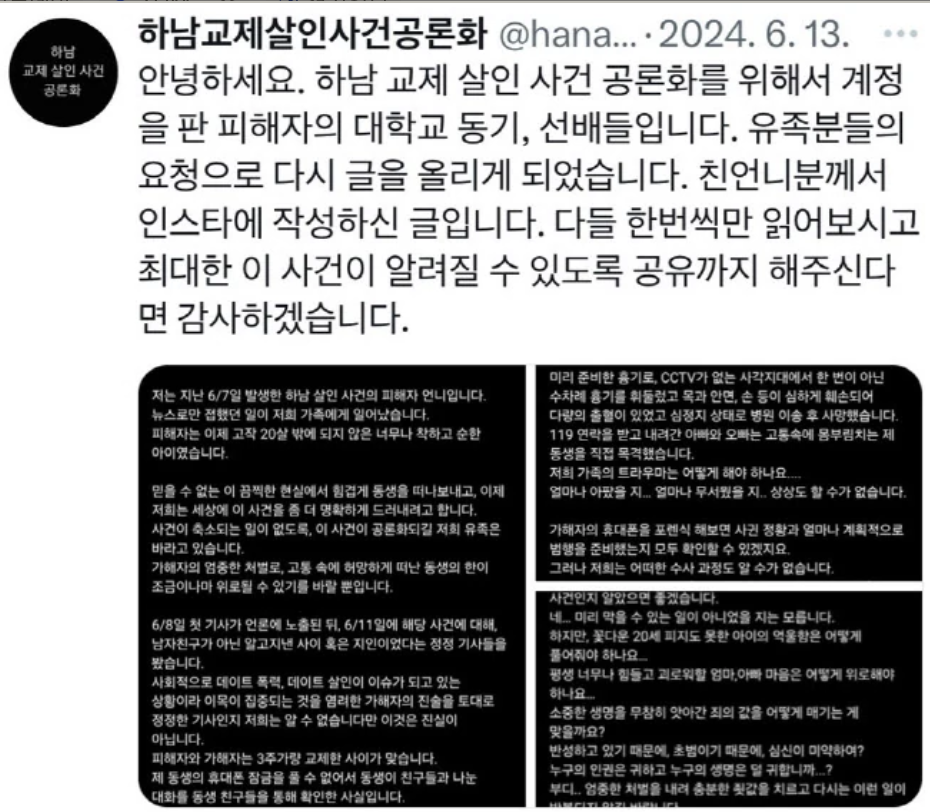 μ΄λ² 'νλ¨ κ΅μ μ΄μΈ' μ¬κ±΄μ μ°λ¦¬ μ¬νκ° μ§λ©΄ν νλ ₯κ³Ό λ²μ£μ λ¬Έμ λ₯Ό μ¬μ€ν λλ¬λμ΅λλ€. νΌν΄μ μ λ°°λ€μ μλ² νΈμλ μ΄ μ¬κ±΄μ λν μ¬νμ κ΄μ¬κ³Ό μ°λ €λ₯Ό λ°μνκ³ μμ΅λλ€.