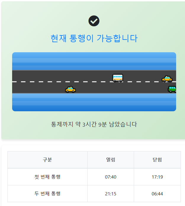 ์ด ์๋น์ค๋ ์ค์๊ฐ์ผ๋ก ์ ๋ถ๋ ๋ฐ๋ท๊ธธ์ ํตํ ๊ฐ๋ฅ ์ฌ๋ถ๋ฅผ ์ ๋๋ฉ์ด์ ์ผ๋ก ์๊ฐํํ์ฌ ๋ณด์ฌ์ค๋๋ค. ๋ฐ๋ท๊ธธ์ด ์ด๋ฆฐ ์๊ฐ๊ณผ ๋ซํ ์๊ฐ์ ์ค์๊ฐ์ผ๋ก ํ์ธํ ์ ์์ด, ์ ๋ถ๋๋ฅผ ๋ฐฉ๋ฌธํ๋ ๊ณํ์ ์ธ์ฐ๋ ๋ฐ ํฐ ๋์์ด ๋ฉ๋๋ค.