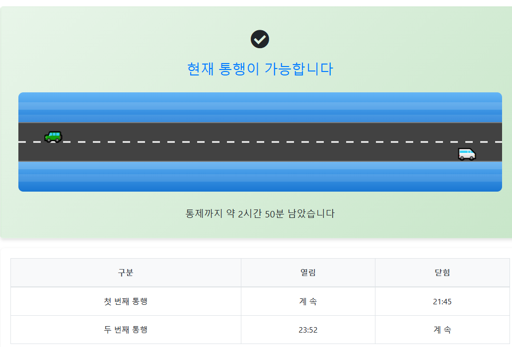 - ์ค์๊ฐ CCTV: ์ ๋ถ๋์ ํ์ฌ ์ํฉ์ ์ค์๊ฐ์ผ๋ก ํ์ธํ ์ ์๋ CCTV ์ ๋ณด๋ฅผ ์ ๊ณตํฉ๋๋ค. ๋ฐ๋ค์ ์ํ๋ฅผ ๋ฏธ๋ฆฌ ์ฒดํฌํ๊ณ ์์ ํ๊ฒ ์ฌํํ์ธ์! ๐น